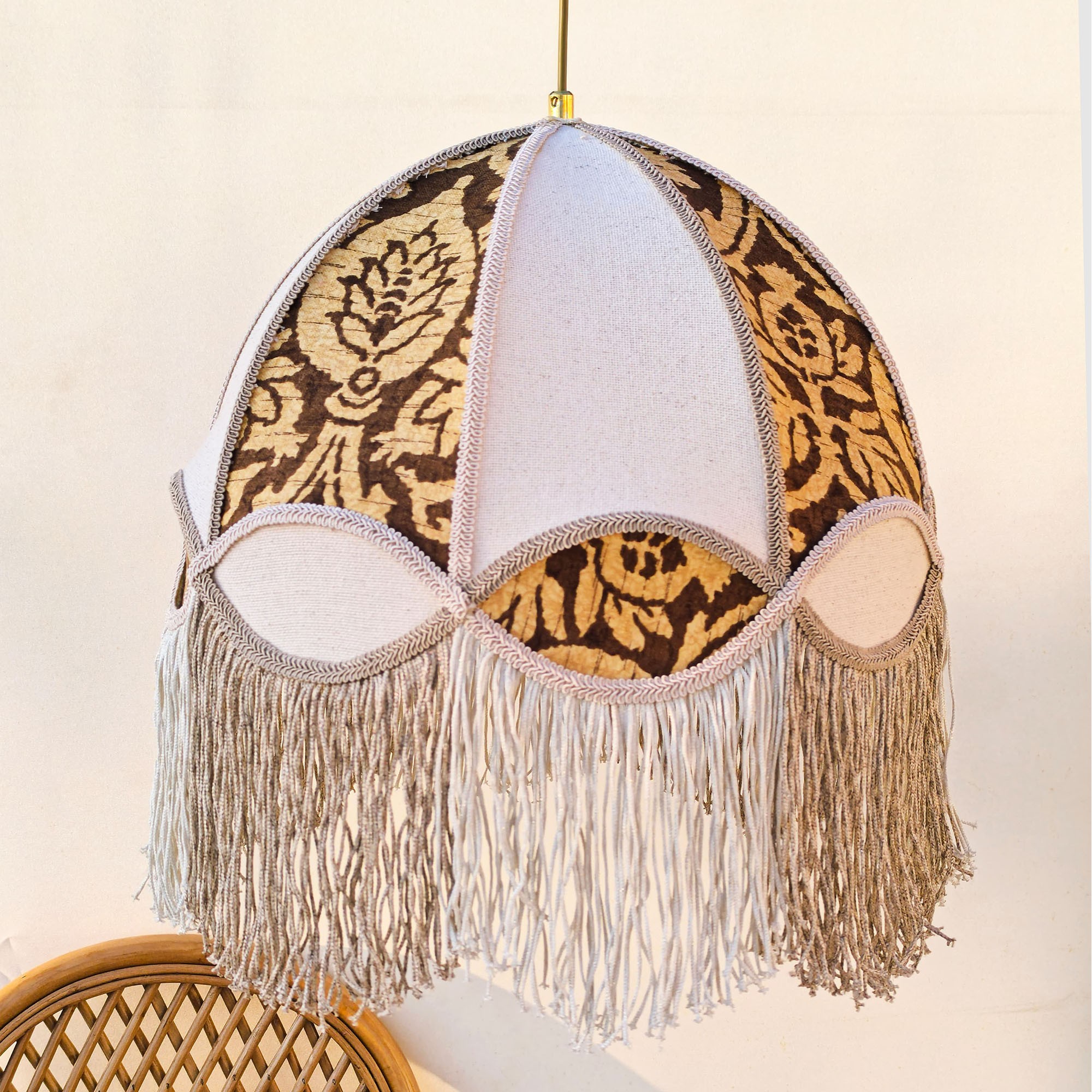 Vintage ruhu ve el işçiliğinin zarif birleşimi olan Boho Püsküllü Kumaş Avize, yaşam alanlarınıza nostaljik ve bohem bir atmosfer katıyor. Özel desenli kumaş paneller ve püskül detaylarıyla özenle el yapımı olarak hazırlanan bu avize, bulunduğu ortama sıcak ve davetkâr bir ışık yayarak estetik bir ambiyans oluşturur. Retro dokunuşu ve bohem tarzı, her mekâna özgün bir karakter katar.