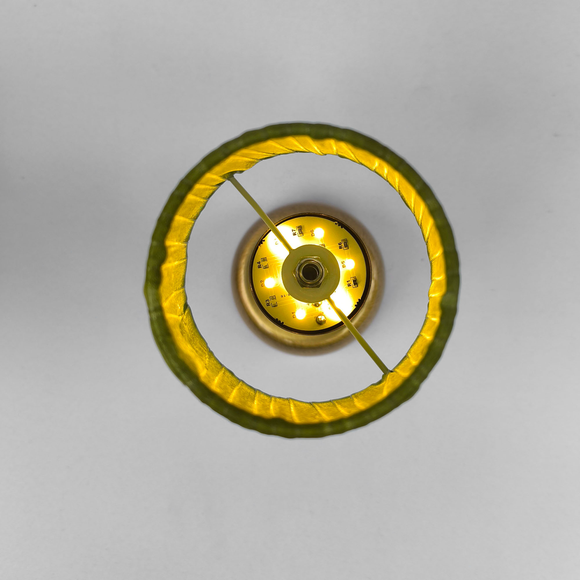 Şık Tasarım: Parlak gold metal gövde, yeşil klasik pileli kumaş başlıkla uyum içinde modern ve sofistike bir görünüm sunar.