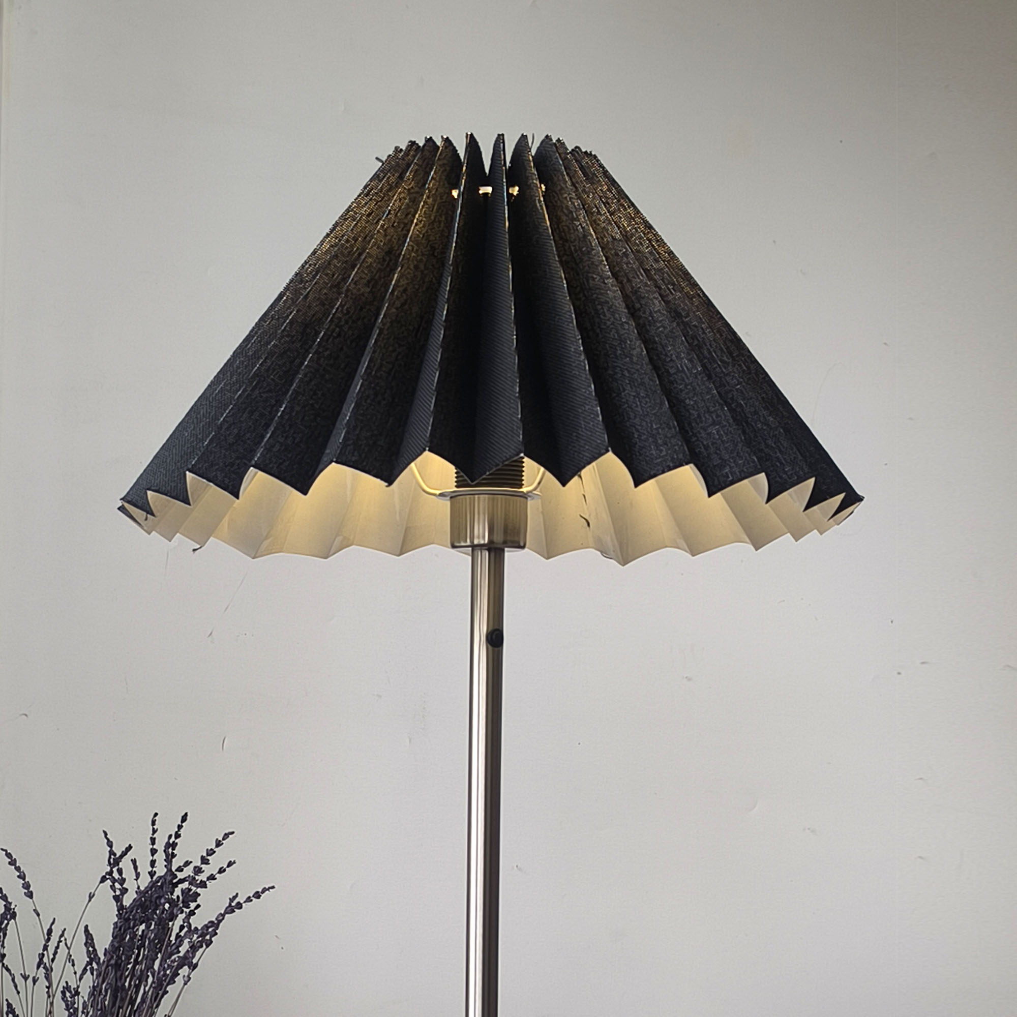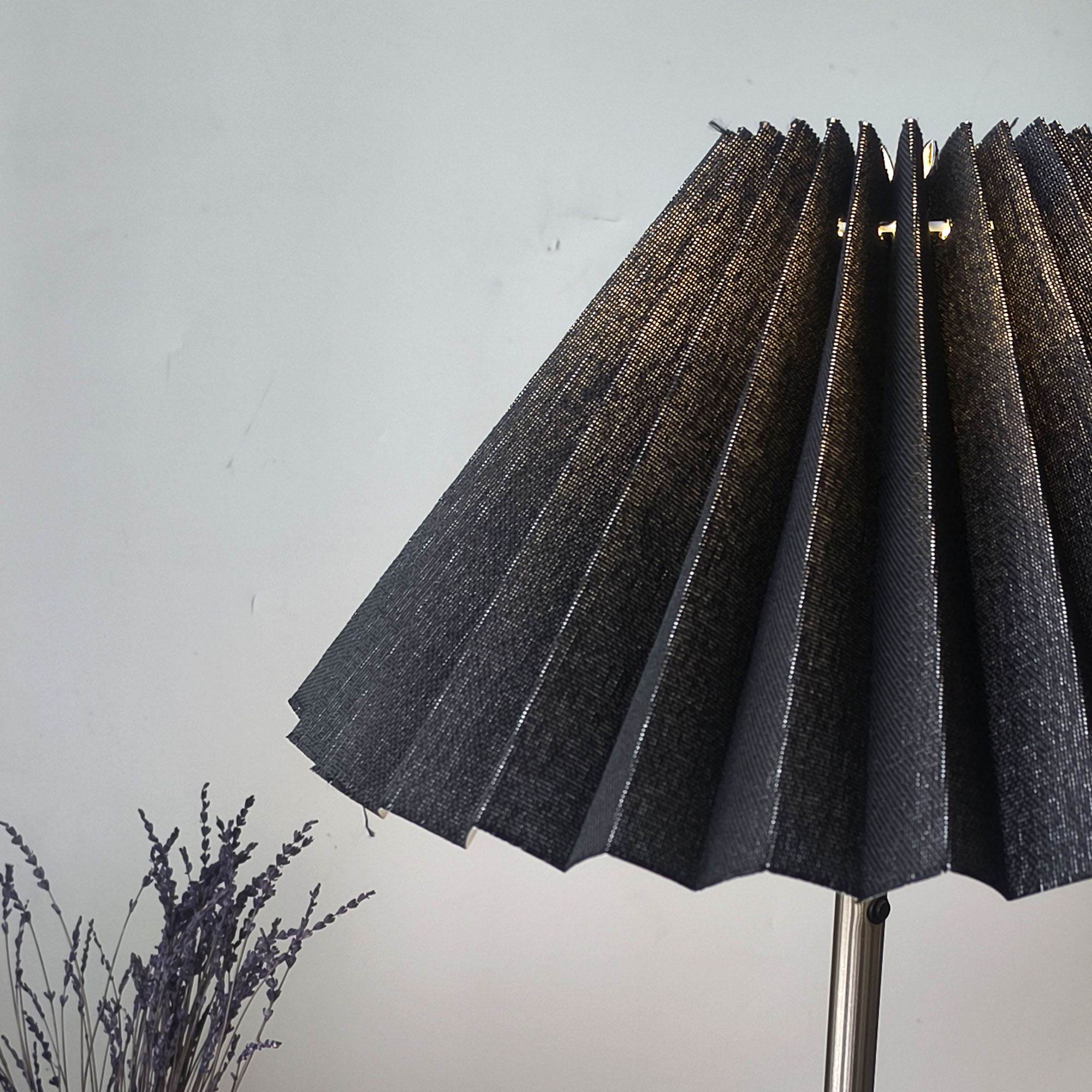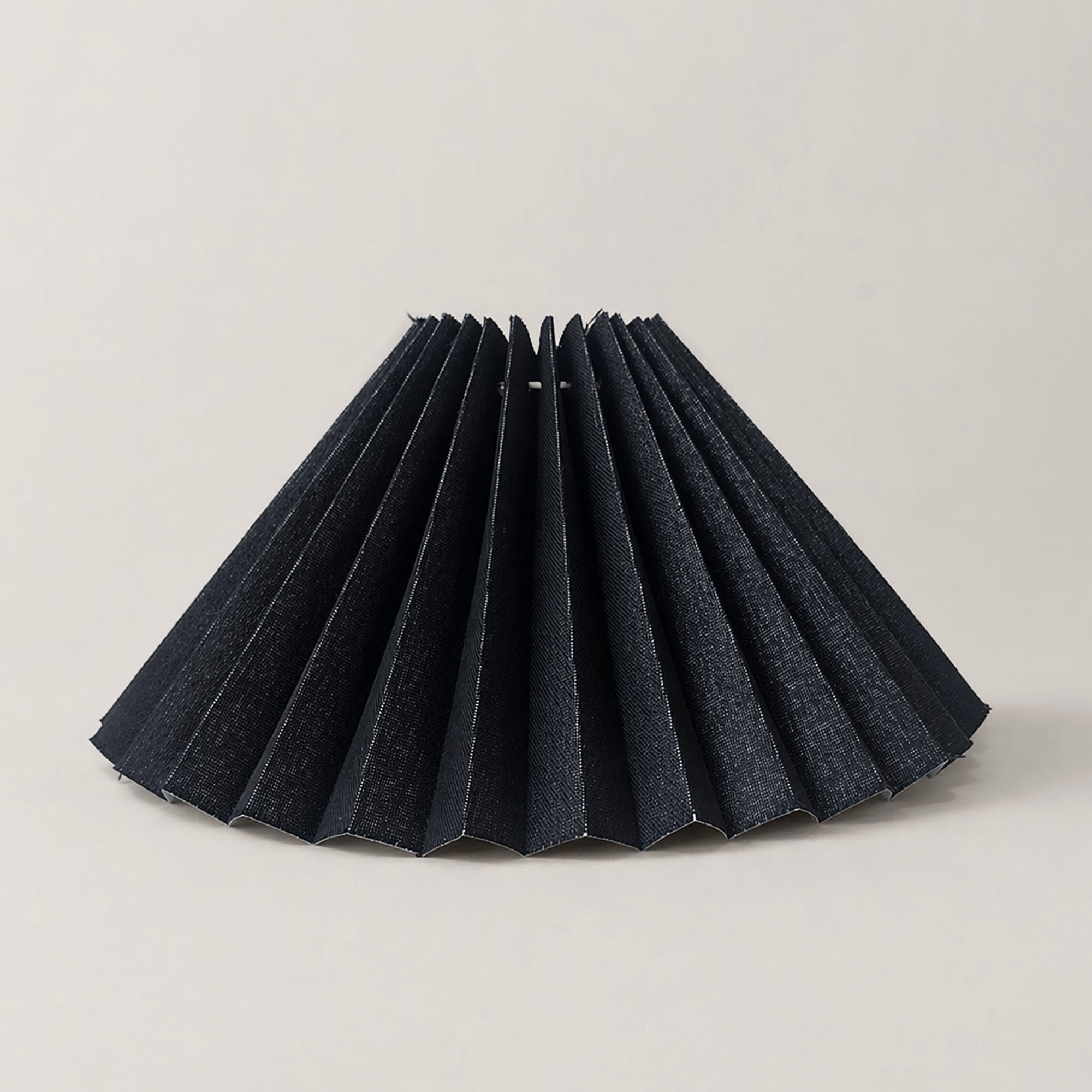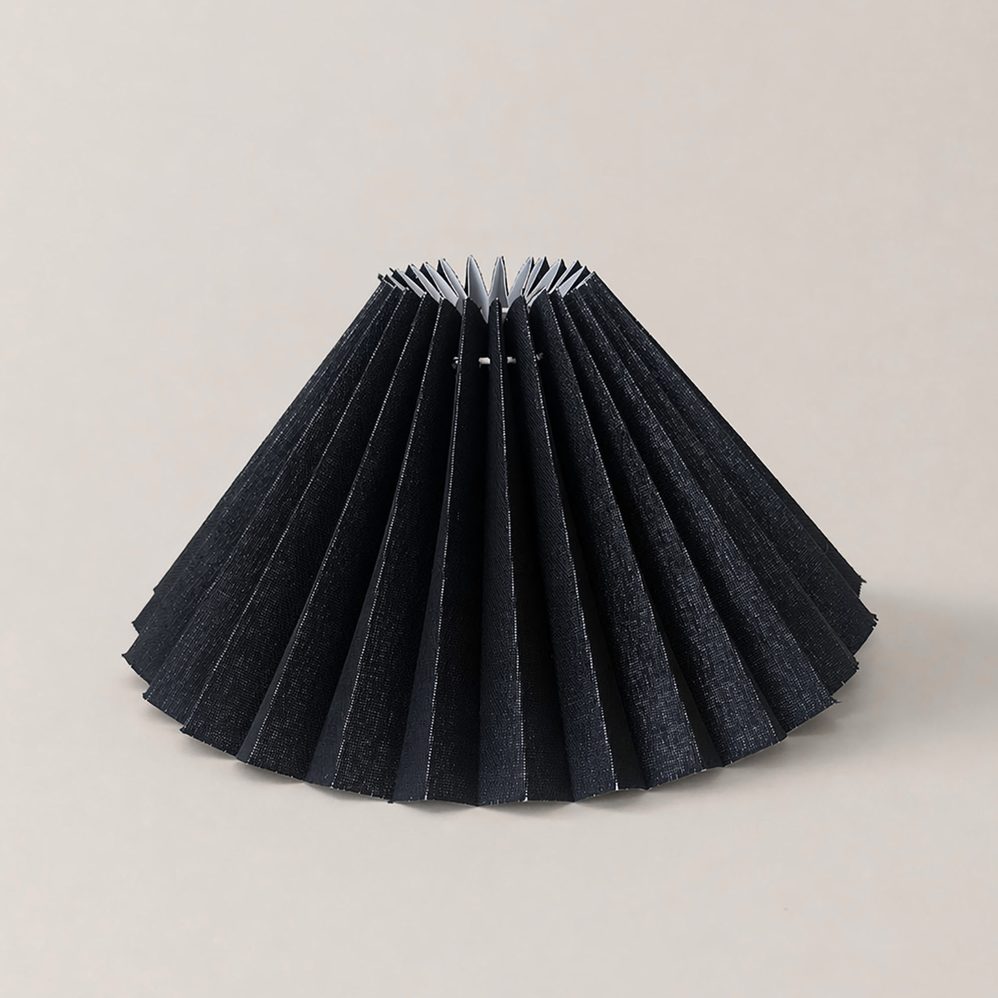 Pleated Perfection koleksiyonunun güçlü karaktere sahip parçası olan siyah hasır dokulu pileli abajur-lambader şapkası, el yapımı üretim kalitesi ve rafine tasarımıyla öne çıkar. 45 cm alt çapı ile dengeli bir silüet sunarken, siyah hasır dokulu yüzeyi mekâna derinlik, doğal karakter, kontrast ve sofistike bir atmosfer kazandırır.