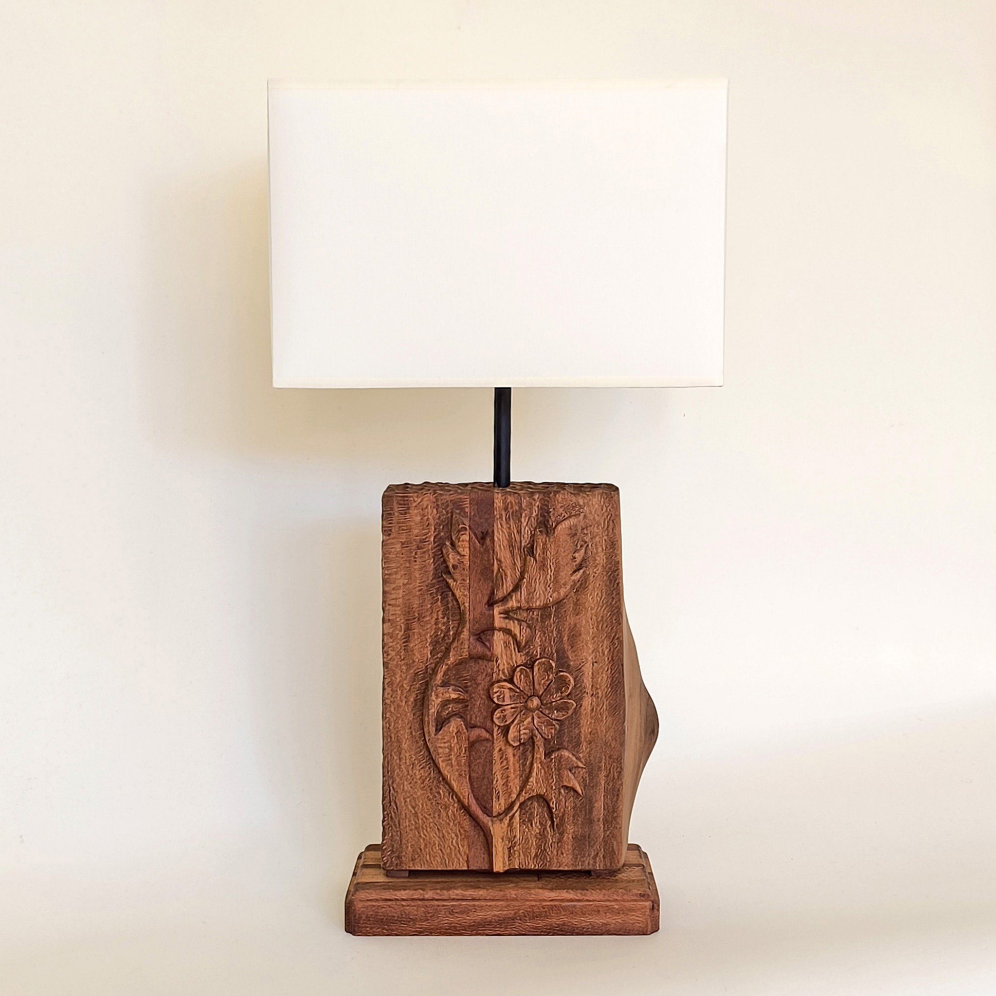 Ahşap sanatçısı Hasan Sezen’in imzasını taşıyan Luminara masa lambası, dikdörtgen krem şapkası ve oyma ahşap tabanı ile modern zarafet ve rustik sanatı buluşturur. Her parça, doğal ahşap dokusu ve el işçiliğiyle işlenmiş çiçek motifleri sayesinde tek ve tekrar edilemez bir obje olarak öne çıkar. Sanatsal tasarımı bulunduğu ortama sıcak bir ışık yayarak sofistike bir atmosfer yaratır.