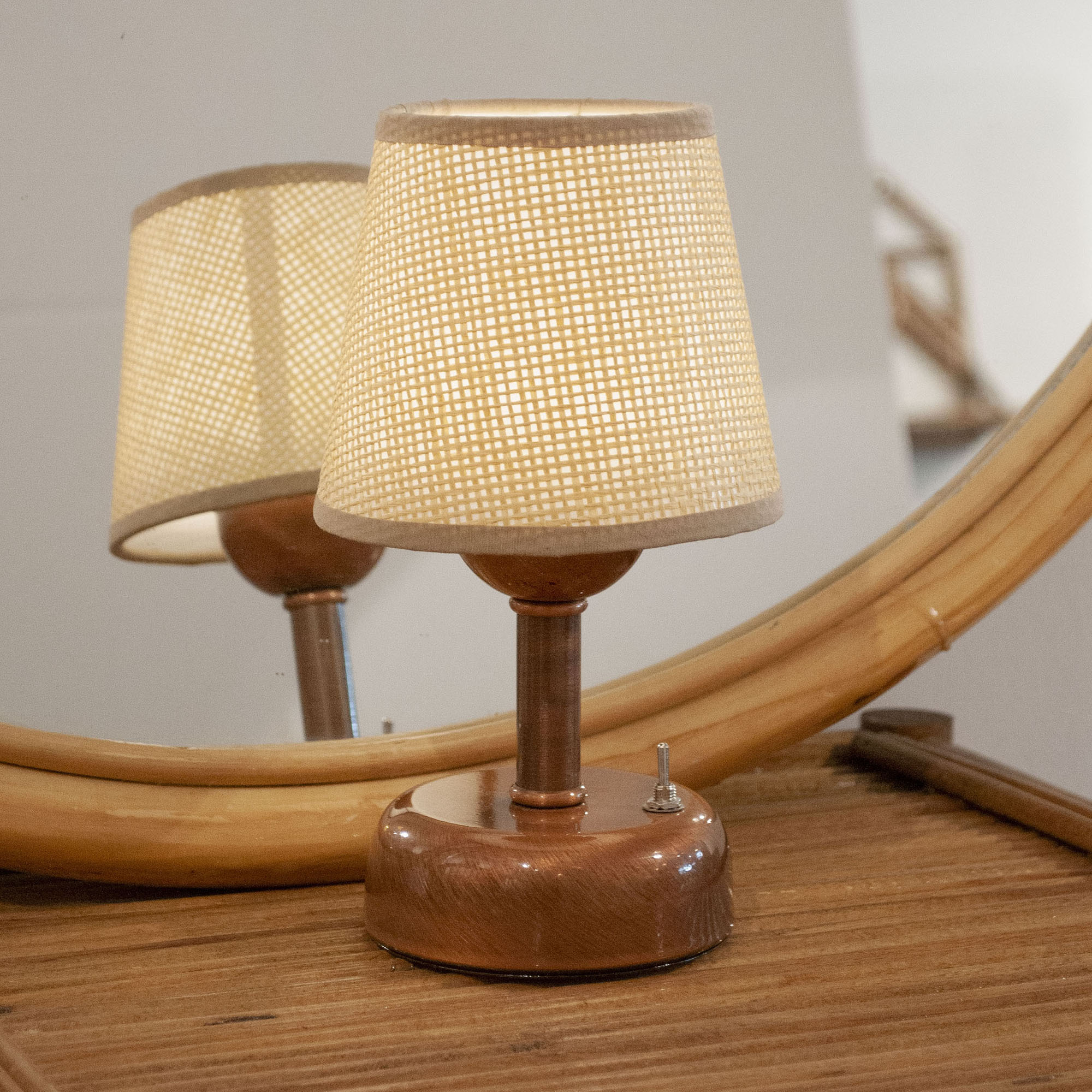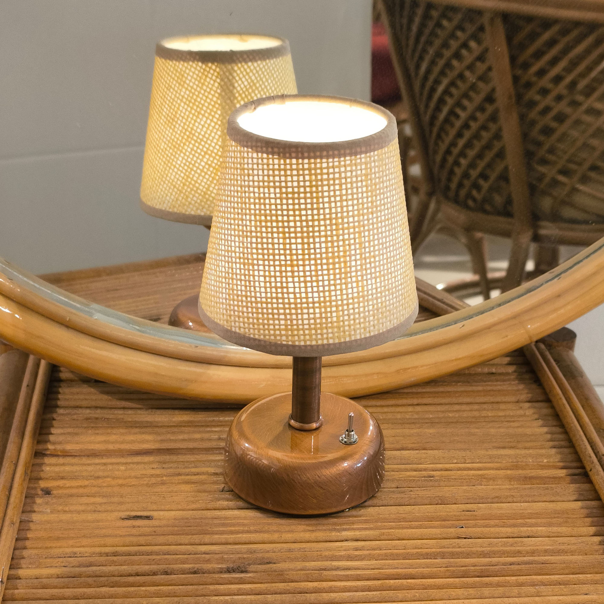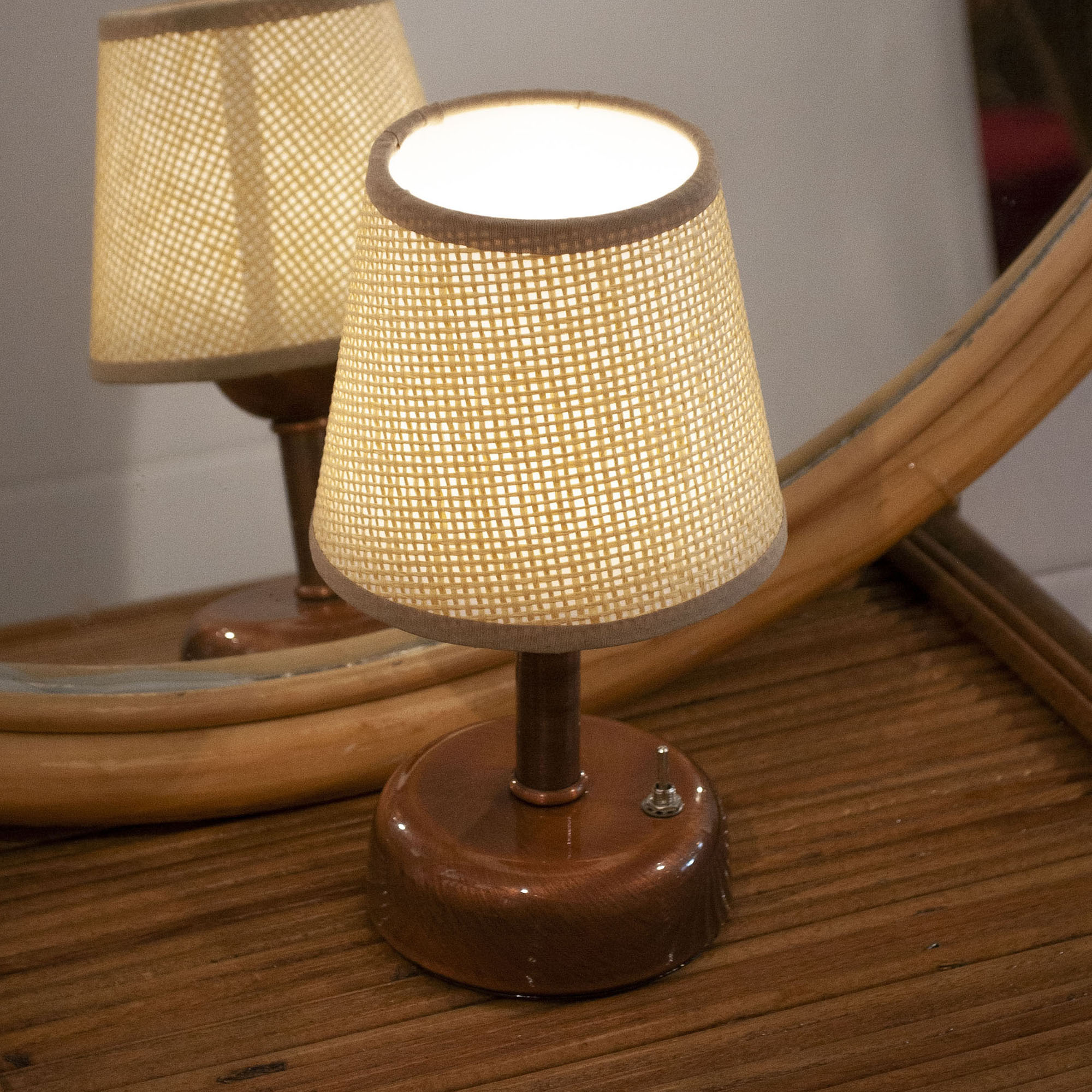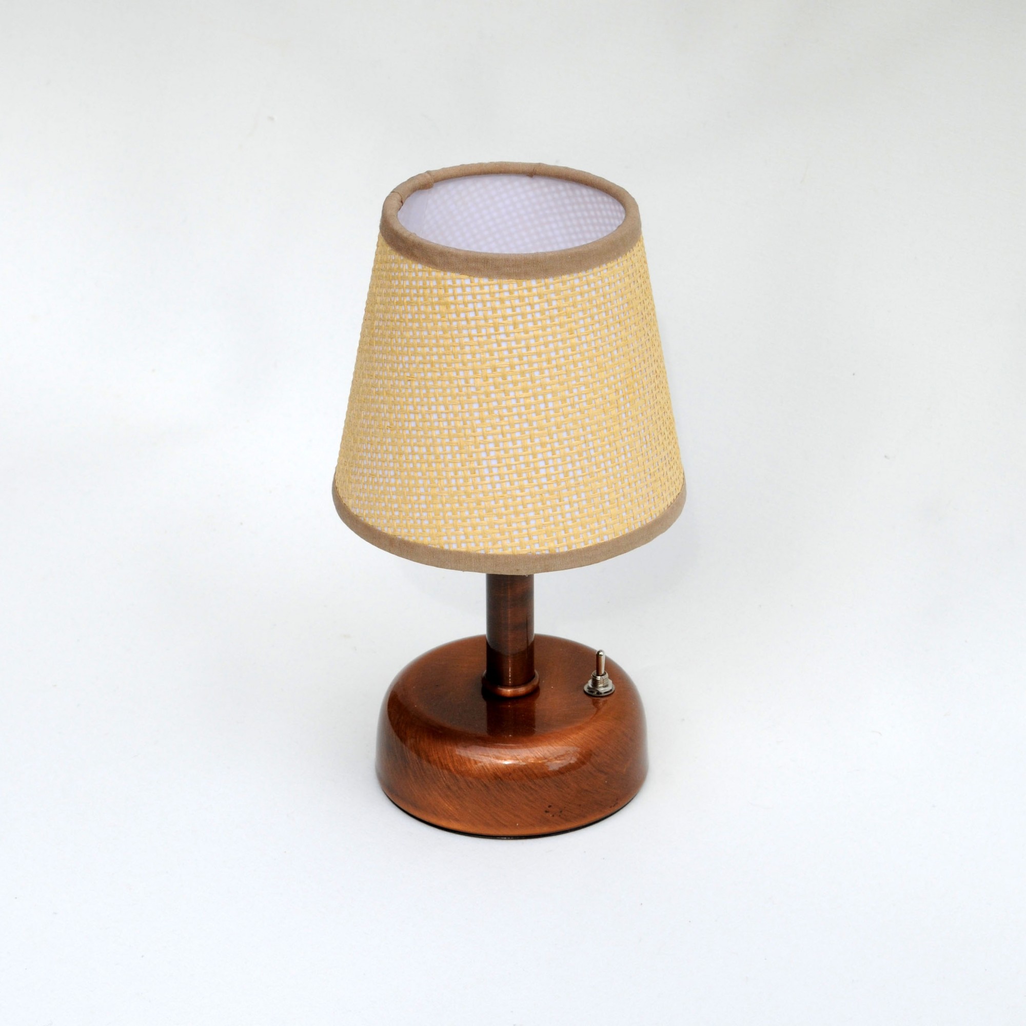Pilli Masa Lambaları: Parlak Bakır Kaplama Pilli Masa Lambası – Hasır Jüt Konik Şapkalı
