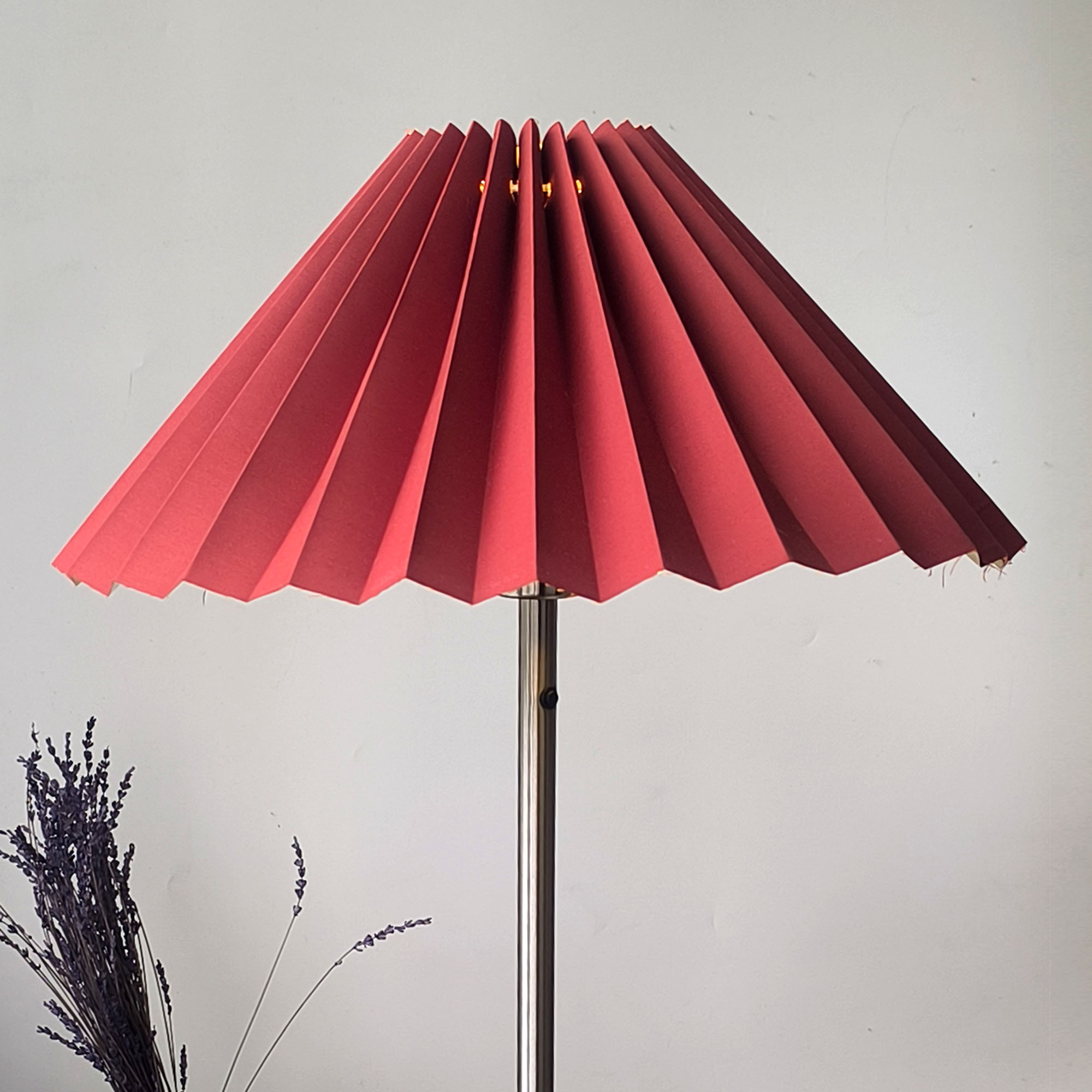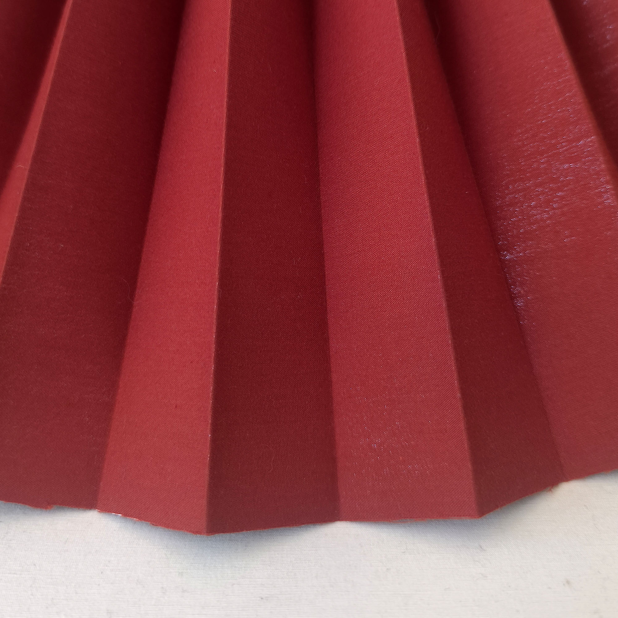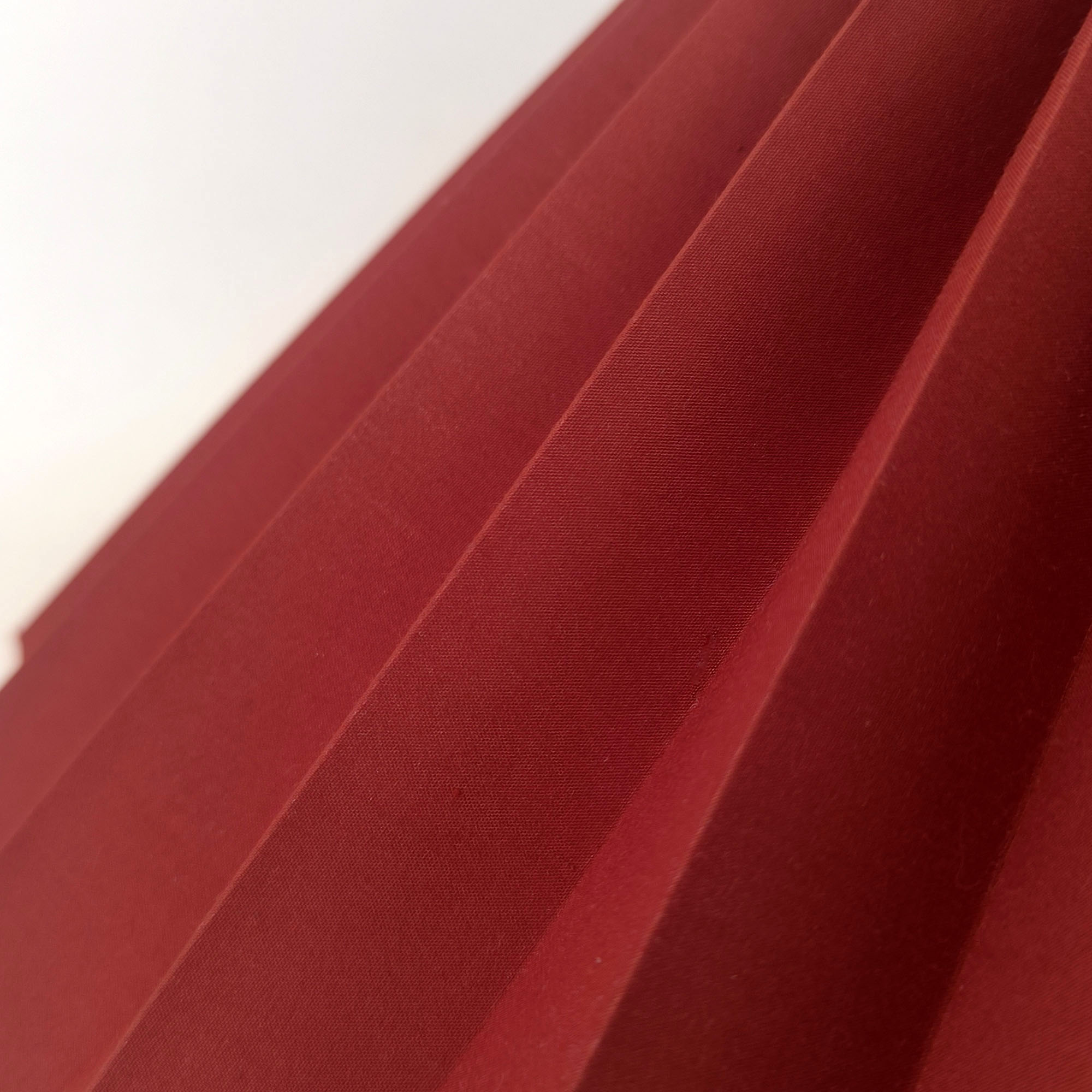 Pleated Perfection koleksiyonunun dikkat çekici varyasyonlarından biri olan bordo kumaş pileli abajur-lambader şapkası, güçlü renk tonu ve iç yüzeyindeki gold kaplama ile ışığı karakterli bir atmosfere dönüştürür. 45 cm genişliği ile dengeli bir form sunarken, bordo rengin derinliği mekâna sofistike ve sıcak bir etki kazandırır.
